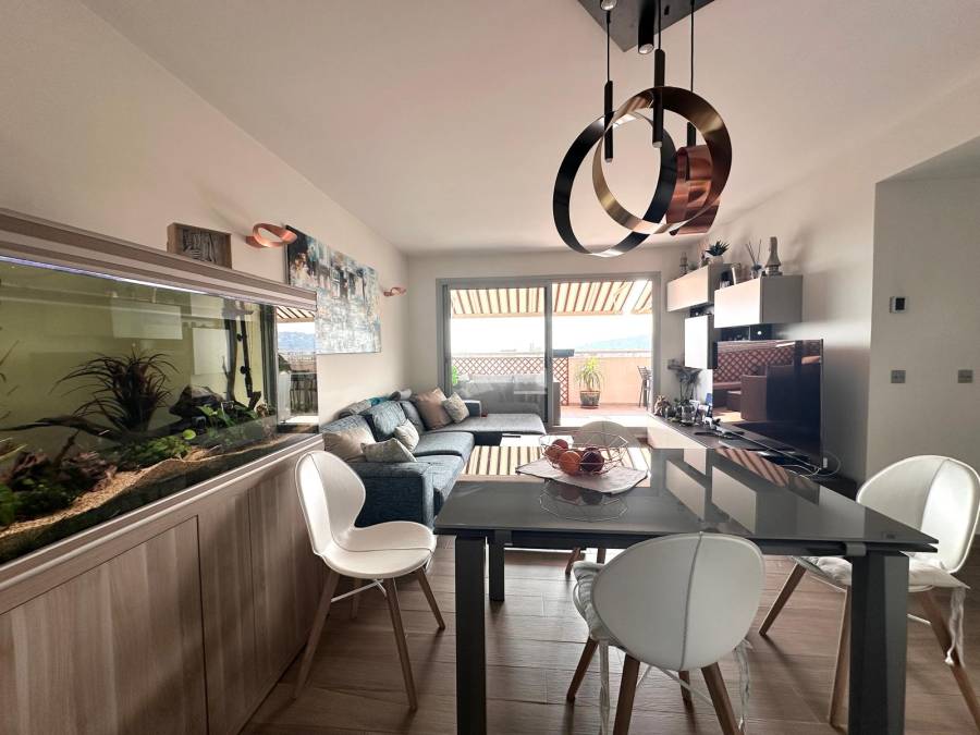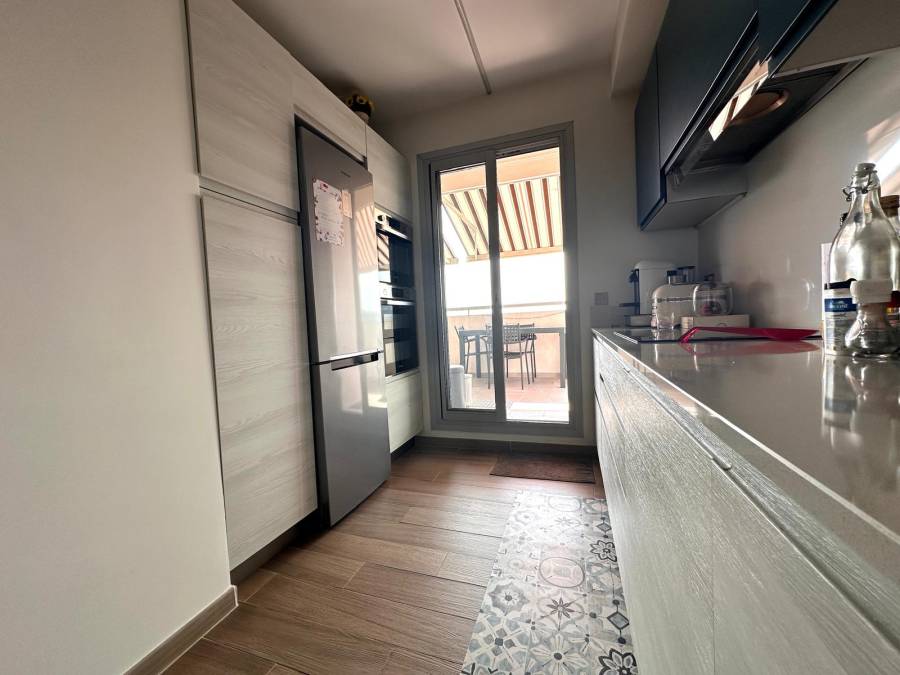 L’appartement se compose d’une entrée avec grand placard, d’une cuisine semi-séparée entièrement équipée, d’un séjour spacieux donnant sur une belle terrasse ensoleillée de 25,72 m² exposée sud, avec vue dégagée et aperçu mer. La terrasse constitue un espace extérieur idéal pour se détendre et profiter de moments de tranquillité. L’espace nuit comprend une chambre principale avec placard et accès direct à la terrasse, une deuxième chambre avec balcon de service et une salle de bain avec douche et WC.